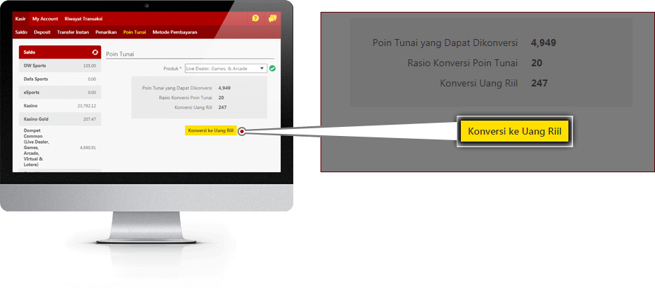 Poin Tunai yang ditukar akan ditampilkan pada saldo Live Dealer, Games & Virtual Anda. Poin Tunai Anda sekarang dapat digunakan untuk bermain permainan kasino atau ditarik sebagai Uang Tunai.
