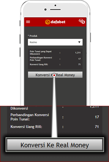 Poin Tunai diberikan setiap kali pemain bertaruh di kasino Dafabet. Setiap 10 satuan mata uang dipertaruhkan, Anda akan mendapat 2 poin tunai. Poin tunai tersebut bisa dikonversikan langsung dan mudah diuangkan.